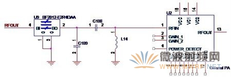以上我們討論了功放電路的輸入回路的兩個組成部分,帶通濾波器和Π型匹配網(wǎng)絡,有了這兩個部分,我們就可以設計一個完整的輸入回路了。如圖3-6所示,就是一個設計完整的功放電路輸入回路。圖中的U9就是一款成品的帶通濾波器,而C108,C109和L14就組成了一個Π型匹配網(wǎng)絡。