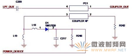 我們在這里用單獨的一節(jié)來討論外圍的檢測電路,其實要講的就是Atheros的方案,因為這個設計實在是太有個性了,讓我們來一起見識一下吧。如圖3-10所示,就是Atheros常用的功率檢測方案。圖中的PC1就是一個印制耦合器(Printed Coupler),來自功率放大器的輸出信號LPF_OUT經(jīng)過耦合器,就在2,3腳感應到高頻交變電壓,這個電壓隨著輸出功率的增大而增大L18,L19,D1,C217,R248組成了常規(guī)的整流電路,這樣,就得到了隨著輸出功率的變化而變化的直流電壓POWER_DETECT,無線收發(fā)器就可以得到這個電壓值從而做作出相應的動作。