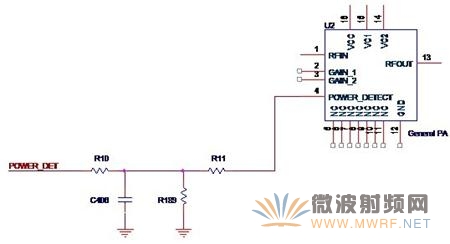 我們在圖3-2中已經(jīng)看到,一般的功放芯片會有POWER_DETECT這樣的一個管腳,這個管腳的作用就是用于功率檢測的。使用芯片內(nèi)建的功率檢測功能可以簡化電路設計,常見的完整形式如圖3-9所示。