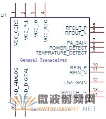 收發(fā)器通常會有很多的管腳,在如圖2-1中,我只給出了射頻電路設計時會關注的管腳,可以看到,有幾個電源管腳,數(shù)字地,模擬地,射頻輸出,功率放大器增益控制,功率檢測,溫度檢測,射頻輸入,低噪聲放大器增益控制,發(fā)射、接收切換等管腳,在接下來的內(nèi)容中,我會把這些管腳分模塊逐個講解。