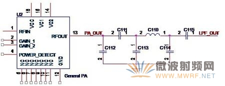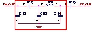 濾波器的設計需要很復雜的計算,在這里我不想探討過多的理論知識,所以,我就不給出如何計算的方法,只給出一般的低通濾波器的形式。這里需要指出的是,Atheros的設計一般會使用三個元件,而Ralink一般會使用五個元件。如圖3-7所示,是Ralink常用的濾波器形式。在圖中,C112,C111,C113,C110和C114就組成了一個低通濾波器,來自功放芯片的信號PA_OUT經(jīng)過濾波器后得到LPF_OUT這信號送至后續(xù)電路。