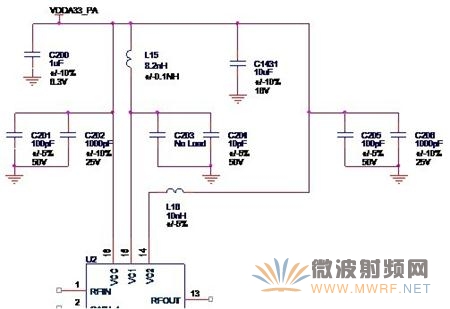 這時,我們就可以把功放芯片的輸出端與低通濾波器相連接,就得到了一般射頻功率放大電路的完整的輸出回路,如圖3-8所示。