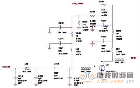 圖中的LNA_GAIN是來自無線收發(fā)器(Radio Transceiver)的增益控制信號,放大器使用的晶體管就是最常用的SGA-8343,R238,R239,R240是基極的偏置電阻,C219,L20,C220組成了低通濾波器,來自切換芯片(Switch)的LNA_IN通過低通濾波器之后經(jīng)由C218耦合至低噪聲放大器,Q2與C221,L51,C214,R240,C210,R239,R238,C211,R241,C215,L52組成了共射極放大電路,最終輸出RFIN送至收發(fā)器進行處理。