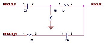 方法一,使用平衡器。原本相位相差180°的差分信號經(jīng)過平衡器(Balun,俗稱巴倫),就可以得到合二為一的單端射頻信號。如圖2-5所示,圖中的F1就是一個平衡器,差分信號RFOUT_P和RFOUT_N經(jīng)過F1得到單端信號RF_OUT。